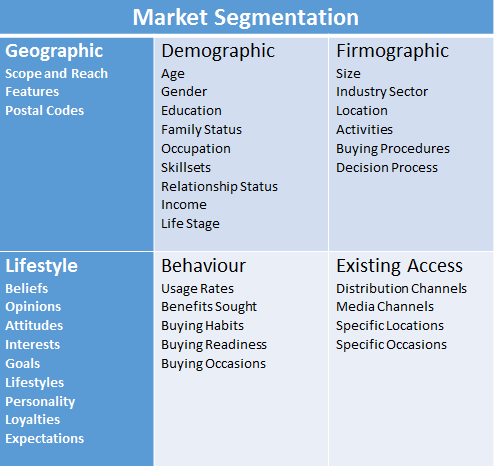 Effective Market Segmentation Market segmentation divides a broad market into subsets to identify and implement strategies to better target and sell them a product or service. The underlying aim is to own or dominate a particular segment by focusing on it alone. You then either leave other segments to others or you also serve that segment but tailor features and messages to align what you have to what they want. A particular segment has several important characteristics and requirements. It can be uniquely described, has durable common needs, is reachable via communication and distribution channels, responds to marketing initiatives in a similar manner, and is large and lasting enough to constitute a viable market. Finding your segment means knowing who you can create value for, what your model customers look like, and who your most important customers are. Markets are generally segmented according to common characteristics. Note this is only a starting point to trying to determine what your market may look like, and the factors are not mutually exclusive. For example, looking at this market segmentation table, you might target local students who are technically savvy with an interest in skateboarding who subscribe to Spotify. Now what might you be able to offer them that they value? ![]() Once you get an idea of what you might offer, you could construct a tree as follows. You first segment the market by what you believe are user classes. Note this may not end up the way it is. Only further questions and discussions with potential customers will bring the segments into focus, and allow you to design your key messages and the channels to reach them. ![]() You might find that after an investigation that there are further segments, for example, seniors and university students, or that teens don't value design as much as professionals do because the use of latest technologies and cutting edge design confers status as a technical wizard. You may find that better segmentation can be done via geographical features. Remote locations may need satellite linking capabilities and adventurers may need more rugged models. Once you have determined you have what you believe is a segment you can cater to, you move on to creating a value proposition. As well as making sure you provide true and significant value to your intended customer, you will also be able to clarify your segment characteristics. © 2015 John B Voorpostel CPA, CA, CMB iaccountant.ca |